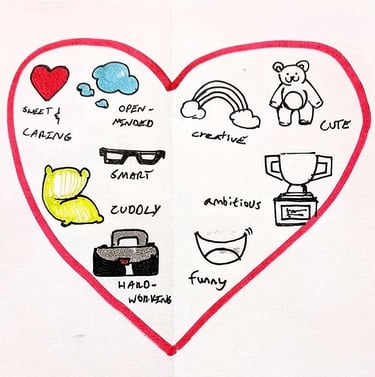 Step 4: On one half of the heart, write or draw the traits you appreciate about your partner. Your partner will do the same on the other half of the heart.