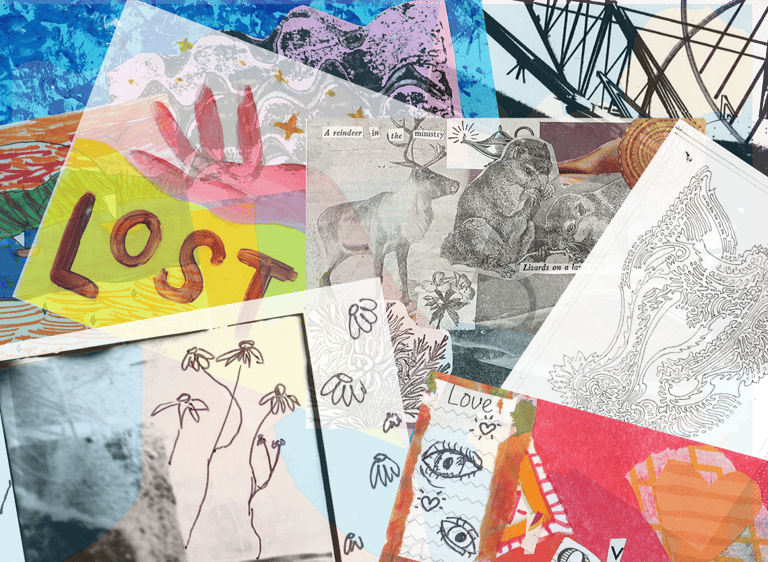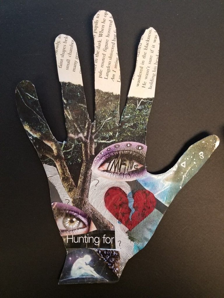 As you collage, be mindful of your energy. Take deep breaths, relax your shoulders, and focus on calming yourself down.