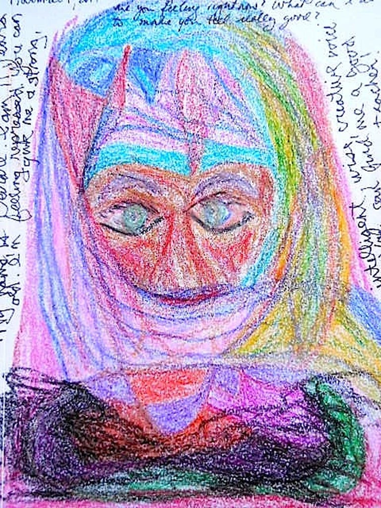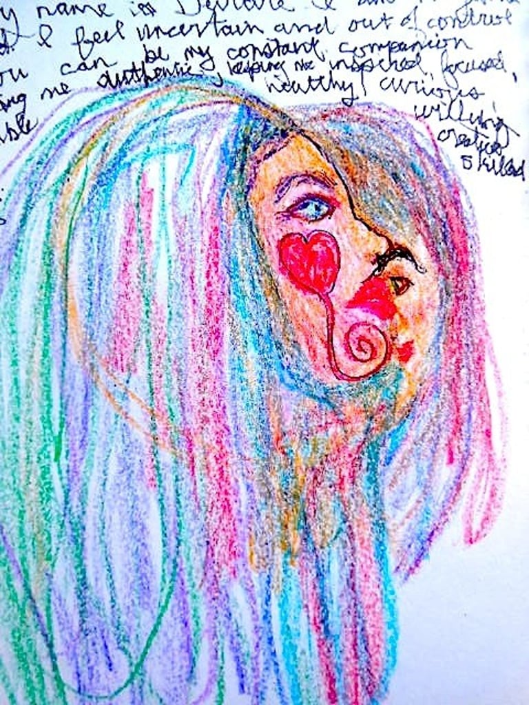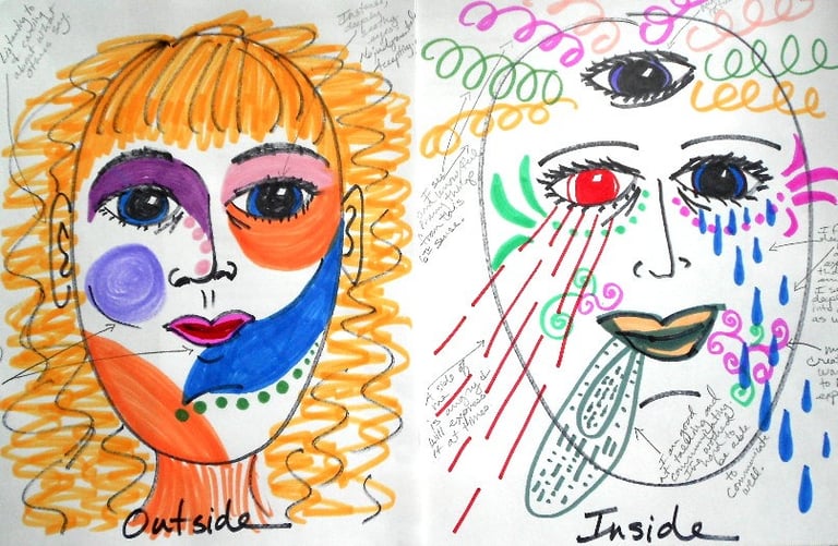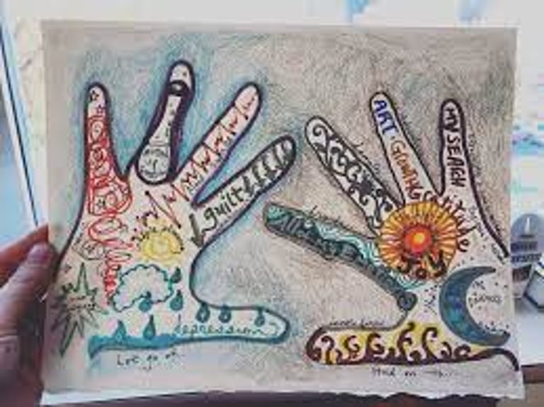 Reflect on what you find challenging about yourself. This might include disappointments, regrets, feelings of hopelessness, or frustration. Now, create an image that represents these thoughts and feelings or your relationship with yourself. You can use abstract colours, shapes, symbols, and lines, or opt for a more realistic drawing—whichever way feels right to express these emotions.