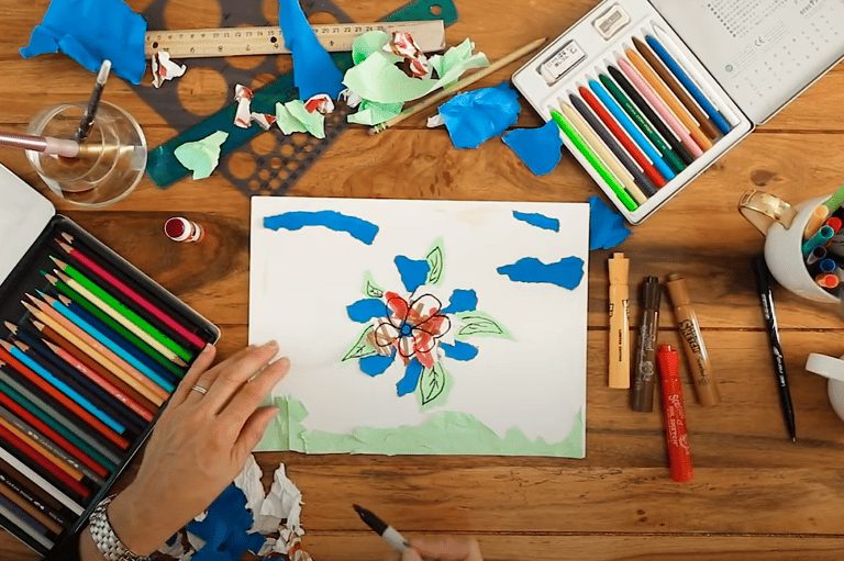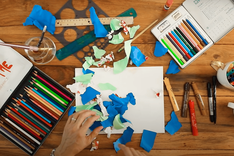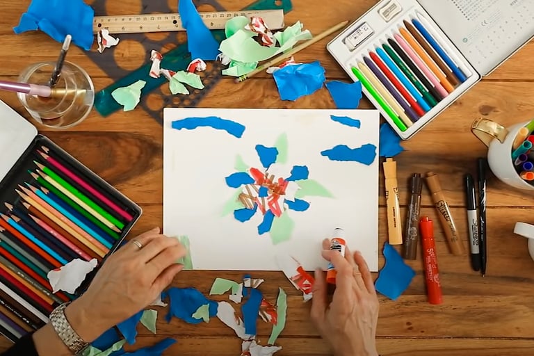 Once your collage is glued down, use markers, paint, crayons, or coloured pencils to add shapes, patterns, or images over the collage.