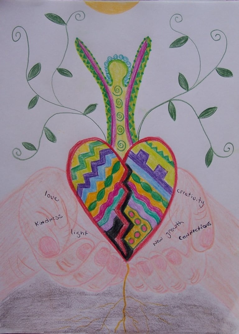 On a new page, create an artwork that offers a compassionate response to the first image. Consider how you can soften and bring kindness to the initial depiction. Use any shapes, lines, and colours that convey a more compassionate, gentle, or kind perspective on the first picture. If this feels difficult, try thinking about what a caring friend might say to comfort you. Then, translate that supportive advice into a visual image.
