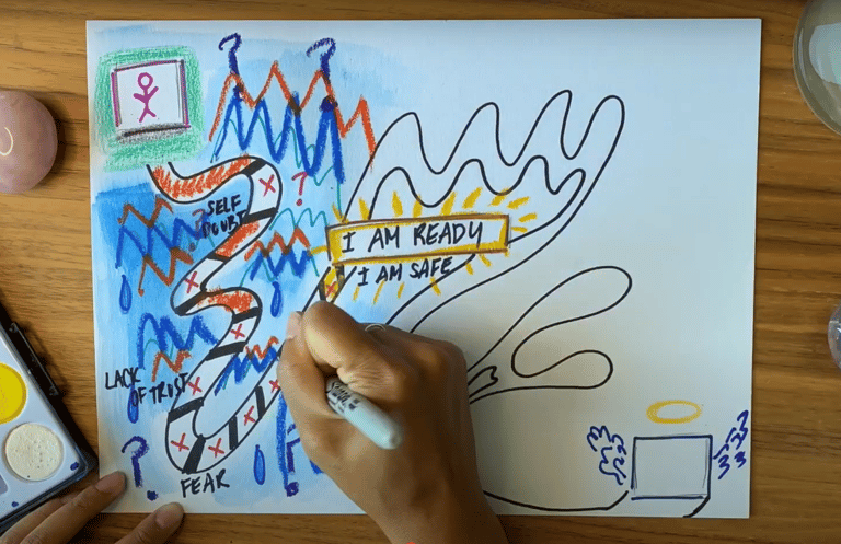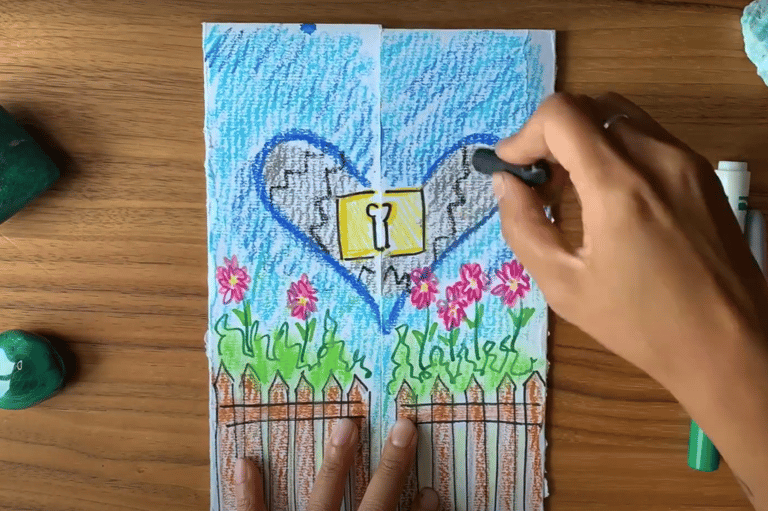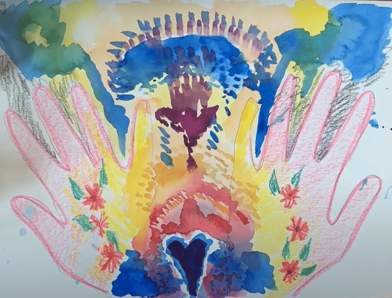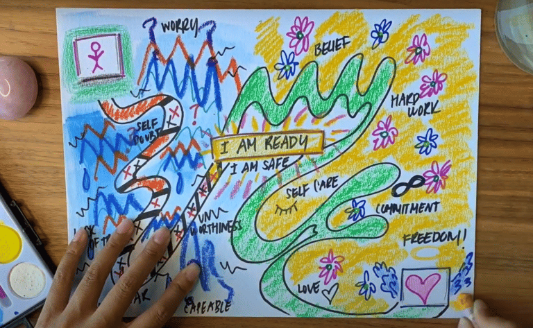 Take a few moments to prepare a peaceful, nurturing space for yourself. You might begin by gently tidying the area and gathering any art supplies you’ll need. When you’re ready, light a candle or some incense to symbolize the start of this journey. If it feels soothing, put on some soft, relaxing music—acoustic, ambient, or nature-inspired sounds can help create a serene atmosphere. (If you’d like recommendations, consider exploring Yellow Brick Cinema on YouTube.) Take a moment to be still and begin connecting with your breath. Gently place your hands on the paper, inhaling deeply and exhaling slowly as you center yourself. This simple ritual sets an atmosphere of focus, indicating it’s time for creative exploration.