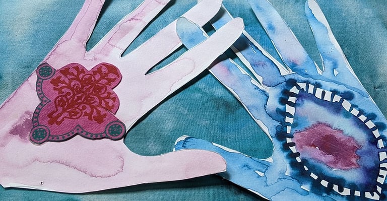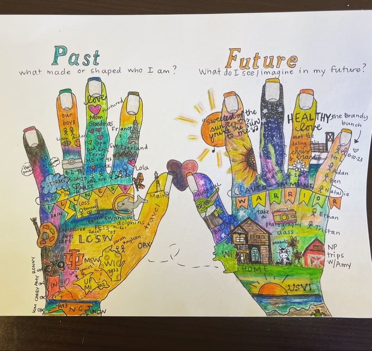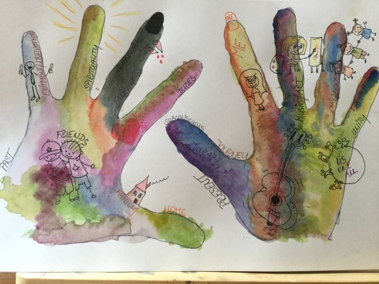 Hands are incredibly important in expressive therapy because they serve as both tools of creation and powerful symbols of personal experience. Through our hands, we express emotions, tell stories, and connect with our external world. They hold memories, represent our ability to give and receive, and symbolize the actions we take in life. From a mental health perspective, focusing on our hands through a symbolic lens is helpful to enhancing our self-awareness, as it allows us a chance to reflect on our strengths, emotions, capabilities, values, and goals in a grounded way.