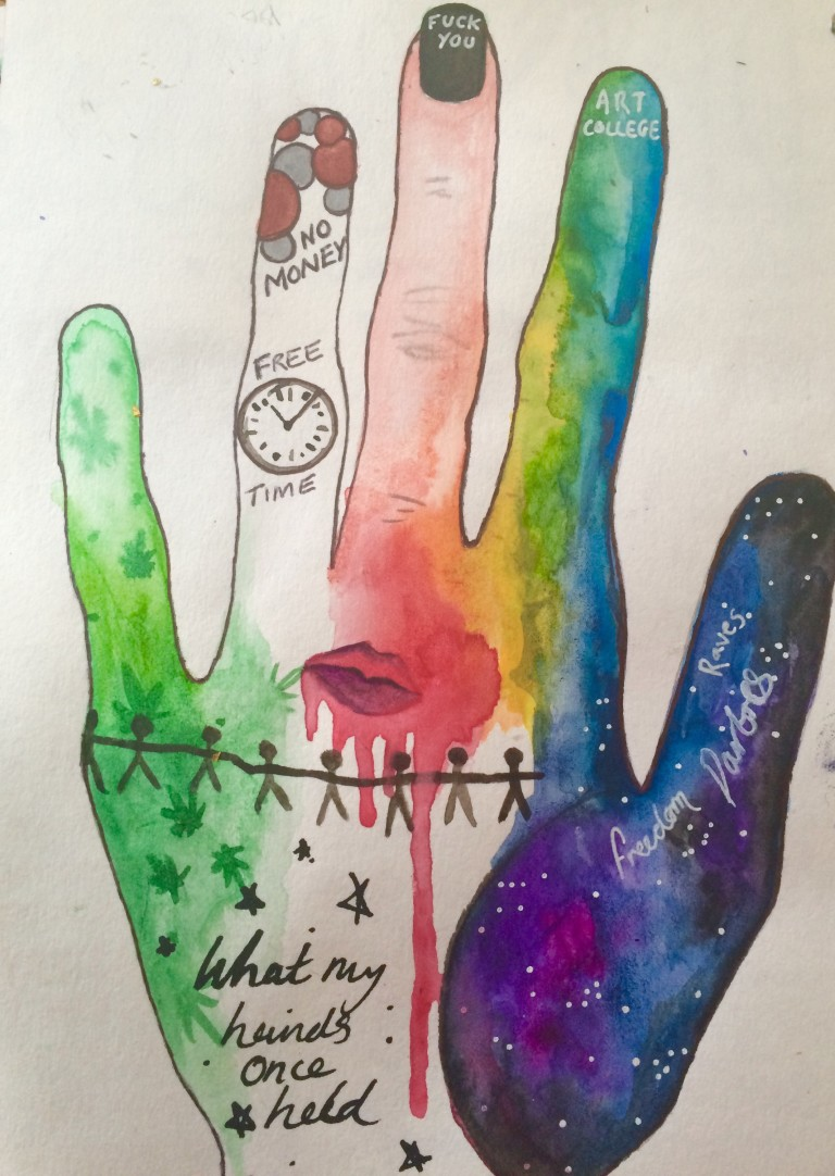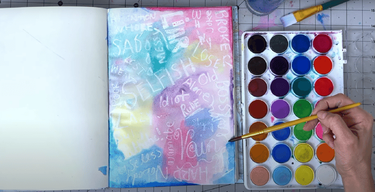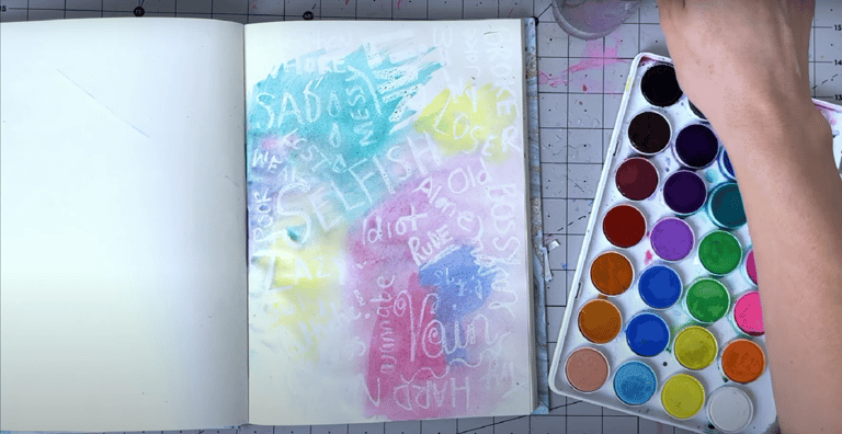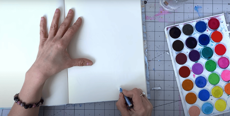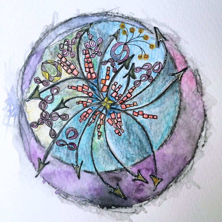 Now it’s time to bring your hands to life with colour. Use watercolors, crayons, or a combination of both to fill in your hands and the surrounding space. Notice how the materials interact—how the wax of the crayon resists the watercolour, and how the colours blend or stand out. Use this time to reflect on the transition from what was, to what is, and what will be.
